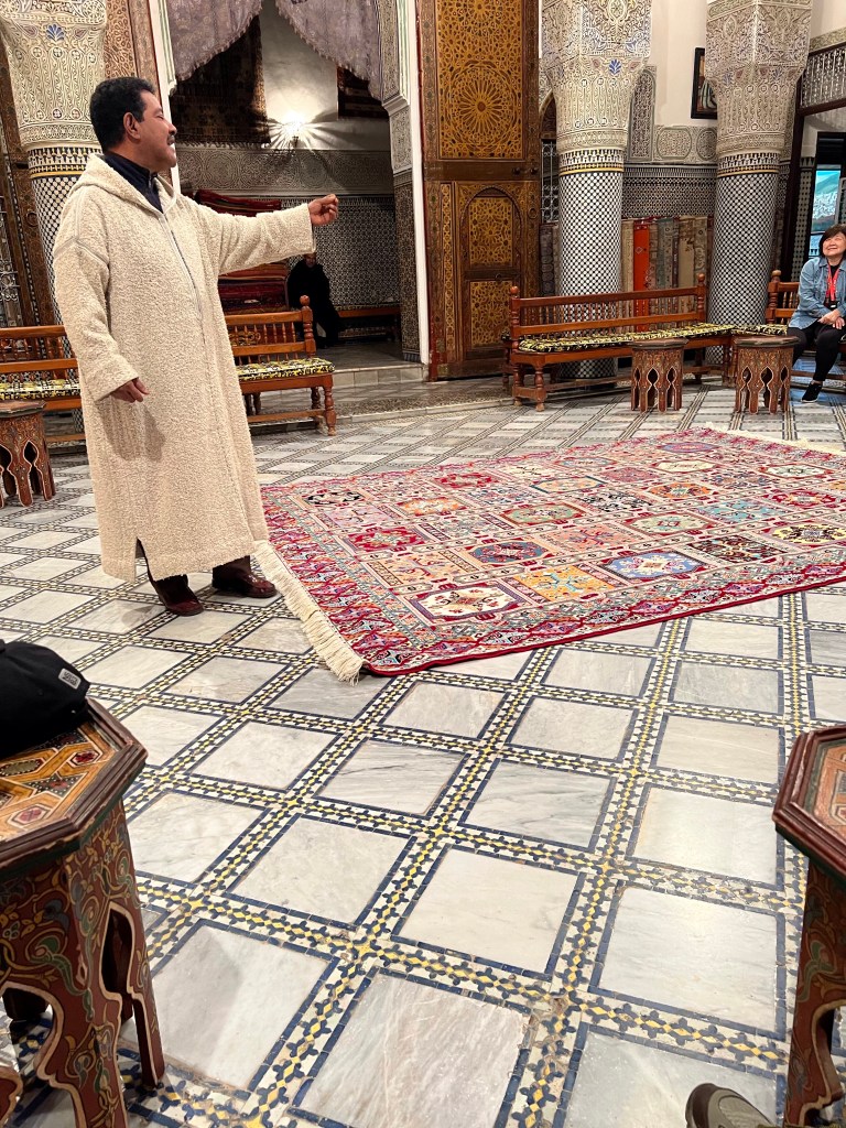 Our guide, Khalid, opened a door for us and we entered into a rug mart. It was in the same kind of building as our hotel with three levels and ornate tiles over the walls and columns. We all sat down and we were served green tea. The owner explained that all the rugs were hand made by women because only women have patience. All of the rugs were made from live wool. One of the 8×10 rugs he showed us took 17 months to make. After the presentation we were all assigned a “person.” Peggy and I made it very clear that we were not buying any rugs so Peggy and he conversed in French. Two of the girls ended up buying rugs. One was shrink wrapped into a tiny bundle and the other rug will be shipped.