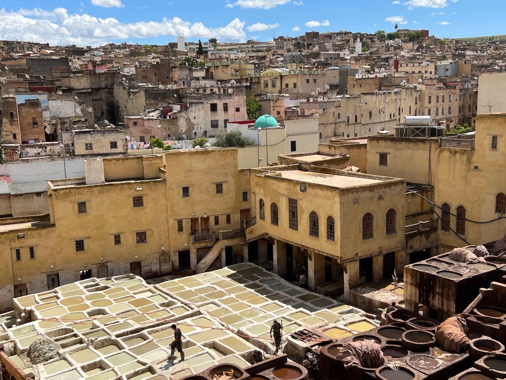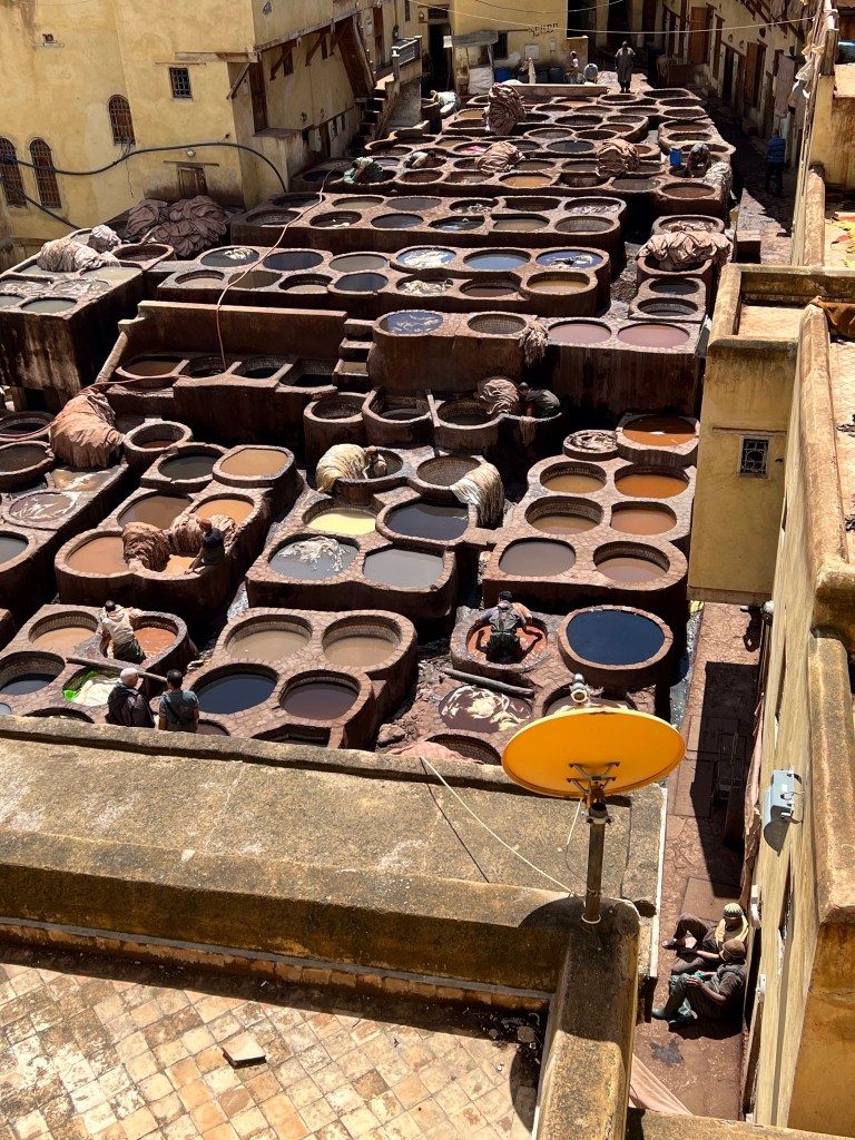 After the rug market we made our way to the tannery. This is the largest in Morocco and the jobs are past down from generation to generation. When I saw the type of work they did, I wondered why? They must pay very well. When we entered the tannery they gave each of us a sprig of mint leaves for under our noses. I put on a mask with lavender oil under my nose. I faired much better than everyone else. The viewing area was above the vat area. To the left were vats that contained a white liquid. We learned later that it was pigeon poop and water. Apparently there is ammonia in pigeon poop. Who new? Believe it or not, but people actually sell their pigeon poop every Friday. The hides go into the pigeon poop for 2 weeks. Then they go into the colored dye vats for another three weeks. Finally the hides are dried on the roofs. We were given different animal hides to feel and by far the softest was camel. After the tour, of course you leave through the store. First room was leather coats. Every color and style imaginable. Prices were very reasonable. If they did not have your size they could make it in 2 hours. The next room was purses and slippers. The ugliest purses I have ever seen. The styles and color combinations were horrible. One of the girls bought a back pack that was very stylish. Original price was $125. She got it for $65.