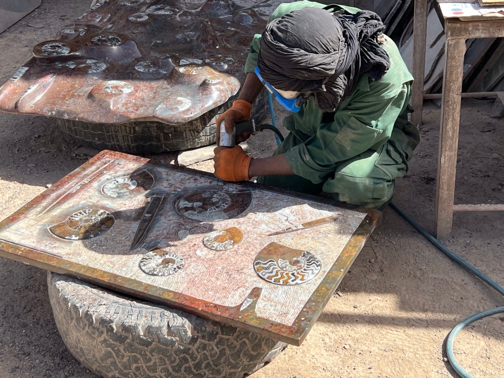 On our way to to the Sahara we stopped at a fossil factory to learn how they cut and polish to reveal the beautiful fossils in them. The long narrow fossils are called squid.