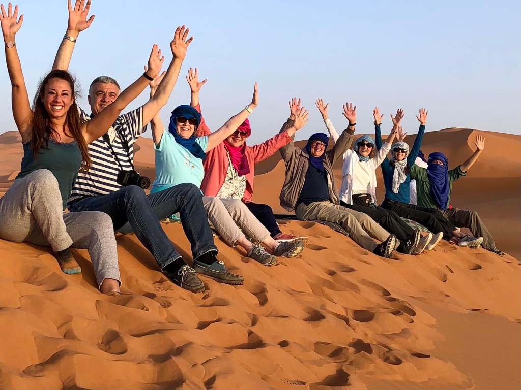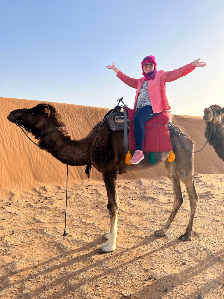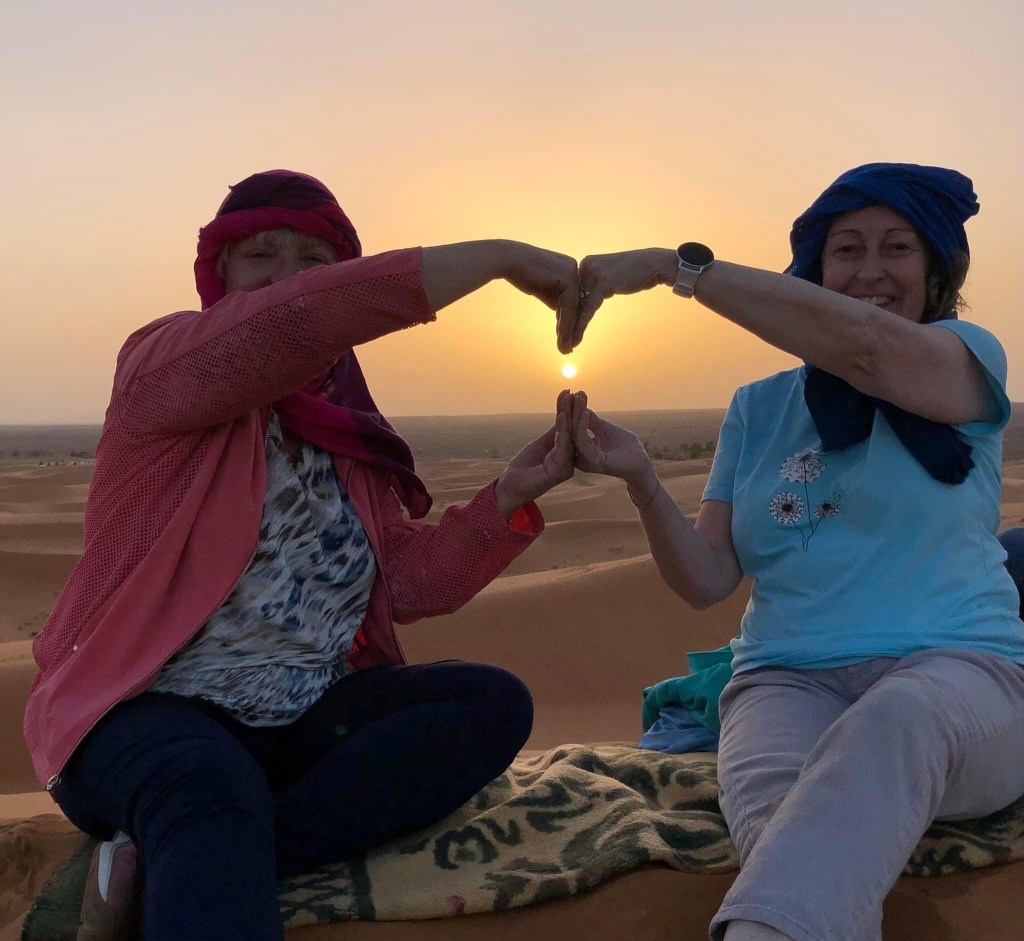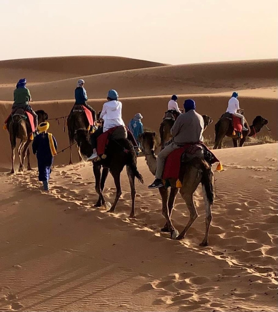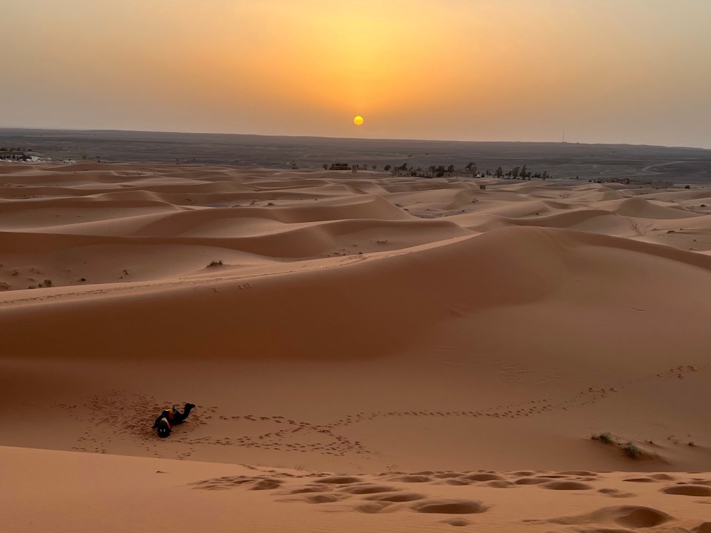 I had ridden a camel in Dubai with the YaYa’s so I was more prepared than most. Everyone had their own camel and there were only 2 camels to each driver so it made for lots of photo opportunities. We walked thru the dunes for about 30 minutes until we got off the camels. Always a little scary when they get down on their knees. We had to walk up a huge dune to get to the top to watch the sunset. The guides were in bare feet which made it easy for them. Not so easy for us.