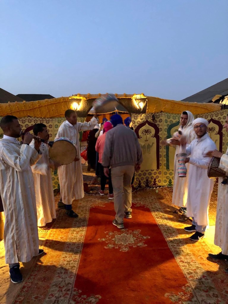 After the sunset our guide had us sit a blanket and he pulled us down the dune to the bottom just like sledding down a hill. Much, much easier than walking in the sand. When we got back to the camp there was a band to musicians to welcome us.