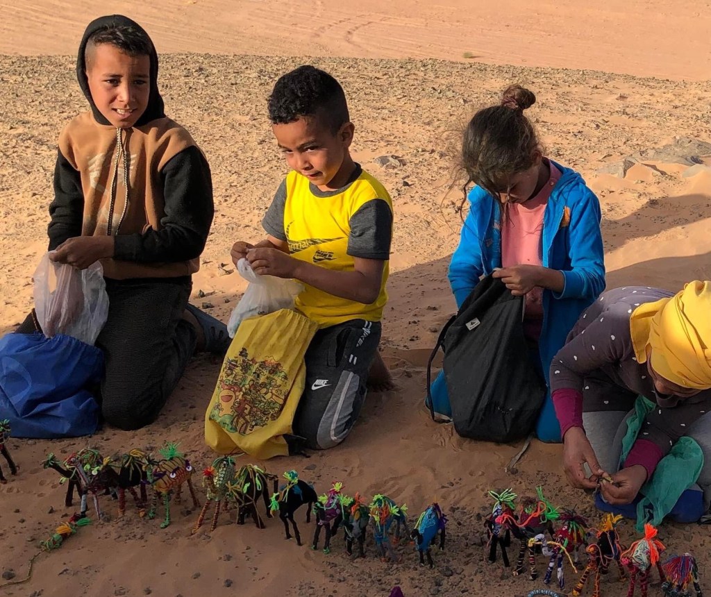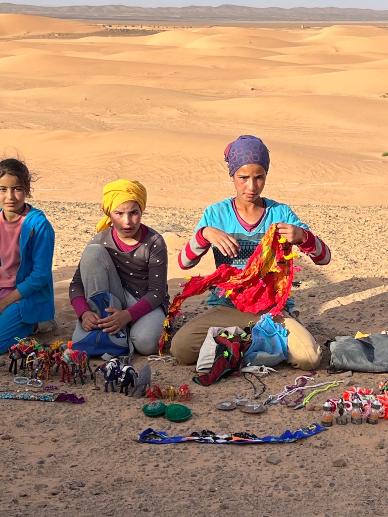 We left our hotel about 3:00 PM in 4x4s for the 2 1/2 hour ride through the Sahara to our camp. It was a long bumpy ride with several stops. Driving in the sand reminded me of driving in a snow storm before the streets are plowed. Except there are no streets in the desert. Every time we stopped for a photo op, children would come out of no where to sell their wares.