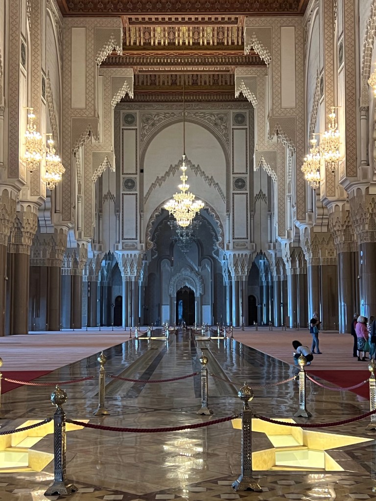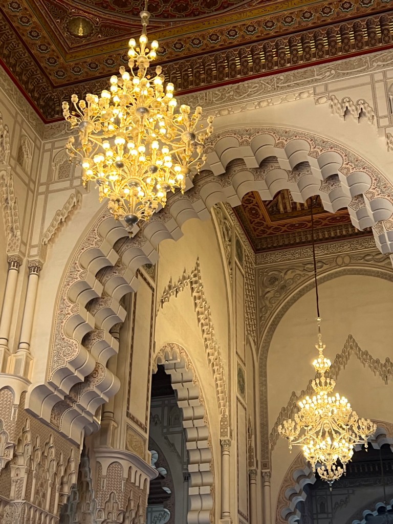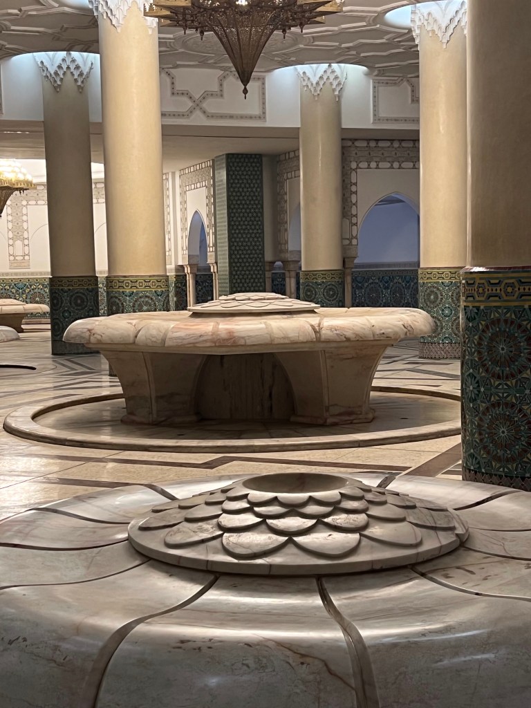 The mosque was built over the Atlantic Ocean as the Koran says that Godβs throne was built upon the water. In the winter the marble floors are heated. In the summer the roof retracts to let in the ocean breezes. 6000 master craftsmen worked on this building carving intricate patterns in the cedar wood ceilings from the Middle Atlas Mountains and the pink granite from Agadir. The gates were made from brass and titanium.