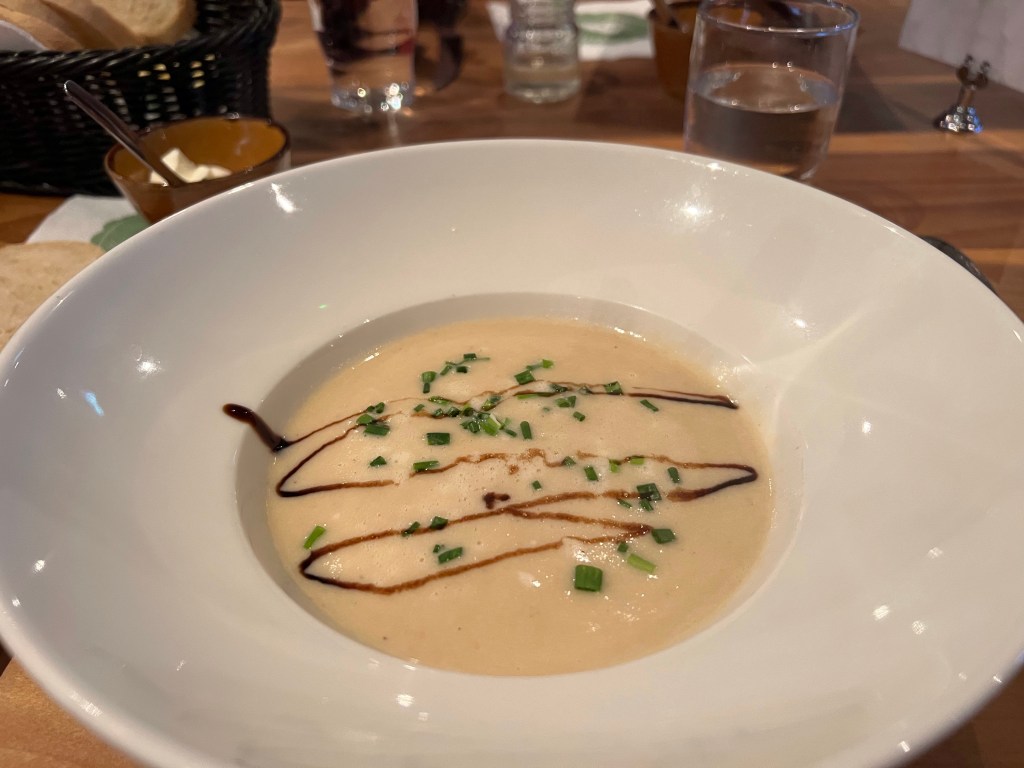 We had a presentation by the ubiquitous perfect Icelandic blonde beauty who’s family had owned the farm since the 1700’s. For an appetizer they gave us this homemade cheesey like substance that they eat like yogurt and gave us whey to drink with it. I think not! Next was cream of celery soup.