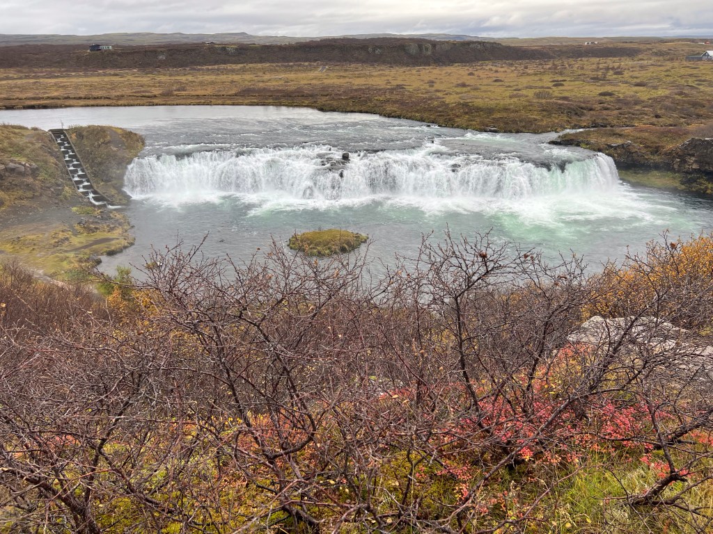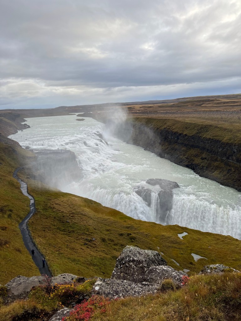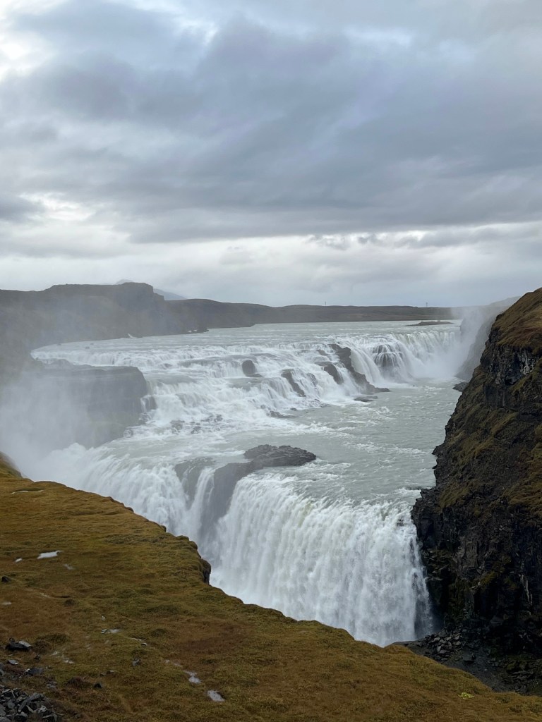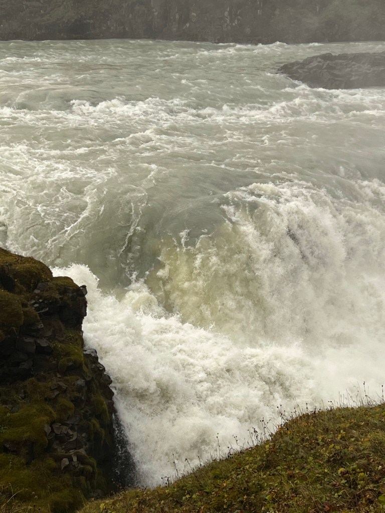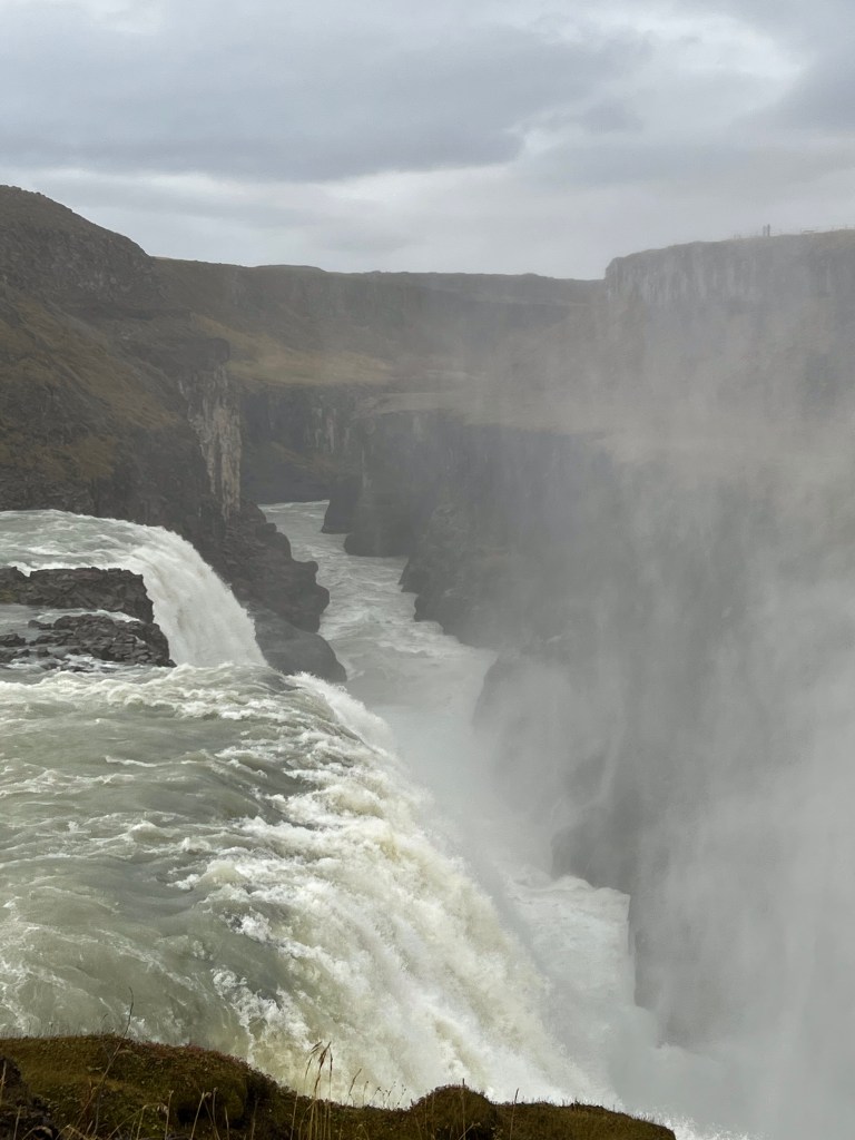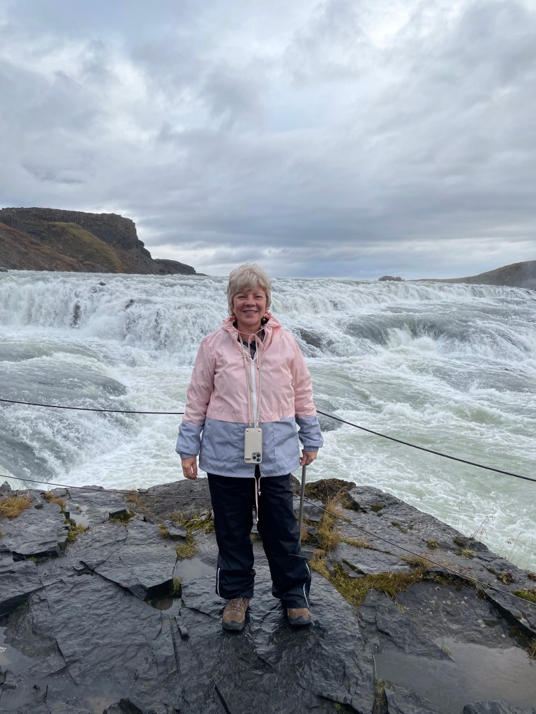 We checked out of our hotel this morning to a very dreary day. Think Rochester in the winter. We stayed up until almost midnight the night before hoping to see the northern lights because it was relatively clear with stars and that was a good sign. It was not to be. Our first stop this morning was at another waterfall. I know you are saying – another one? But believe it or not, they are all so different. This waterfall was called Galicia’s or The Golden Waterfall and apparently this is one of the most impressive waterfalls in Europe. This is another waterfall that Peggy and I pushed to the max.