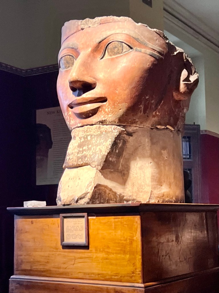 Head of Hatshepsut who reigned from 1473 to 1458 BC and is considered to be the only female Pharaoh. She wears the Red Crown of Lower Egypt (or at one point she did) and the ceremonial false beard of the Pharaoh.