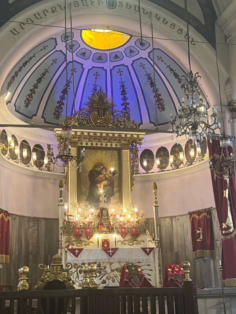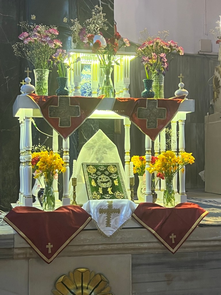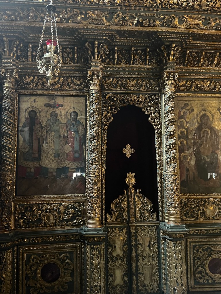 Today was supposed to be an easy walking day as compared to yesterday. Yeh right! 15 thousand steps later and that included 2 hours on a boat sitting down. Today turned out to be basically a church day. We are talking Greek Orthodox, Albanian, Balkin and a couple other offshoots of Greek Orthodox that I can’t remember. All these churches are located in a very old sections of Istanbul with narrow, cobblestone streets filled with speeding motorcycles and cars that don’t care if you are walking in the street because there is no sidewalk. It was a very eclectic neighborhood that appears to be going through gentrification.