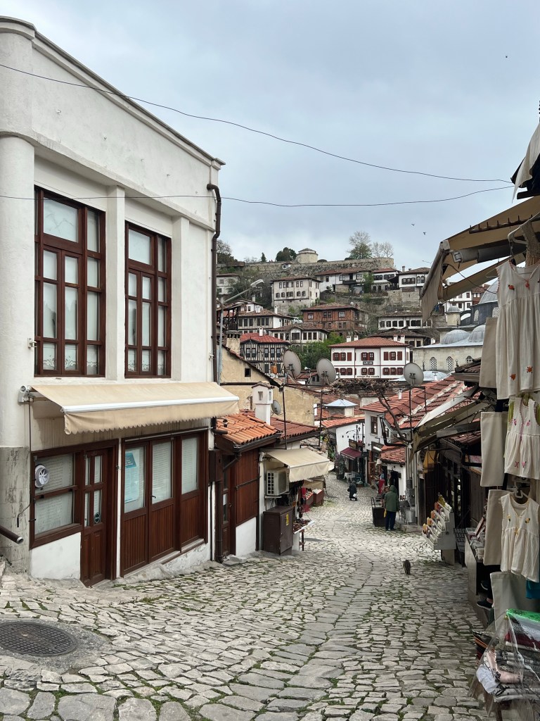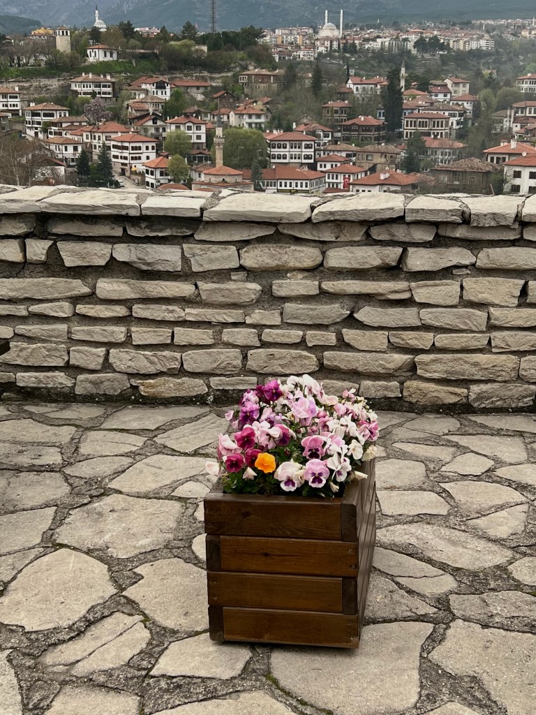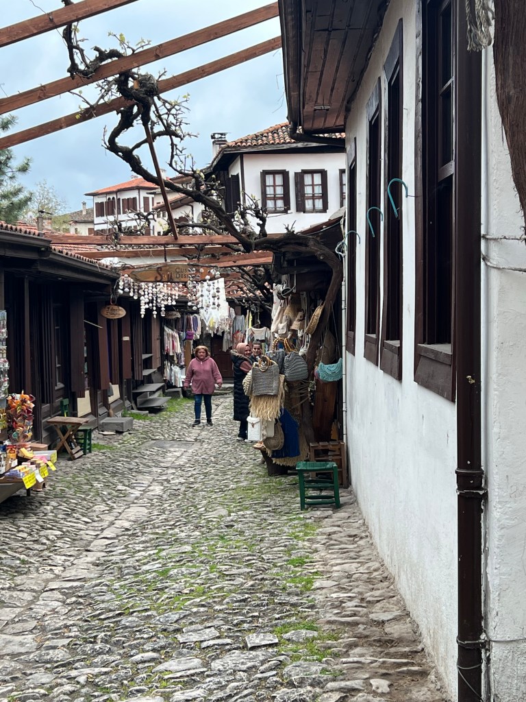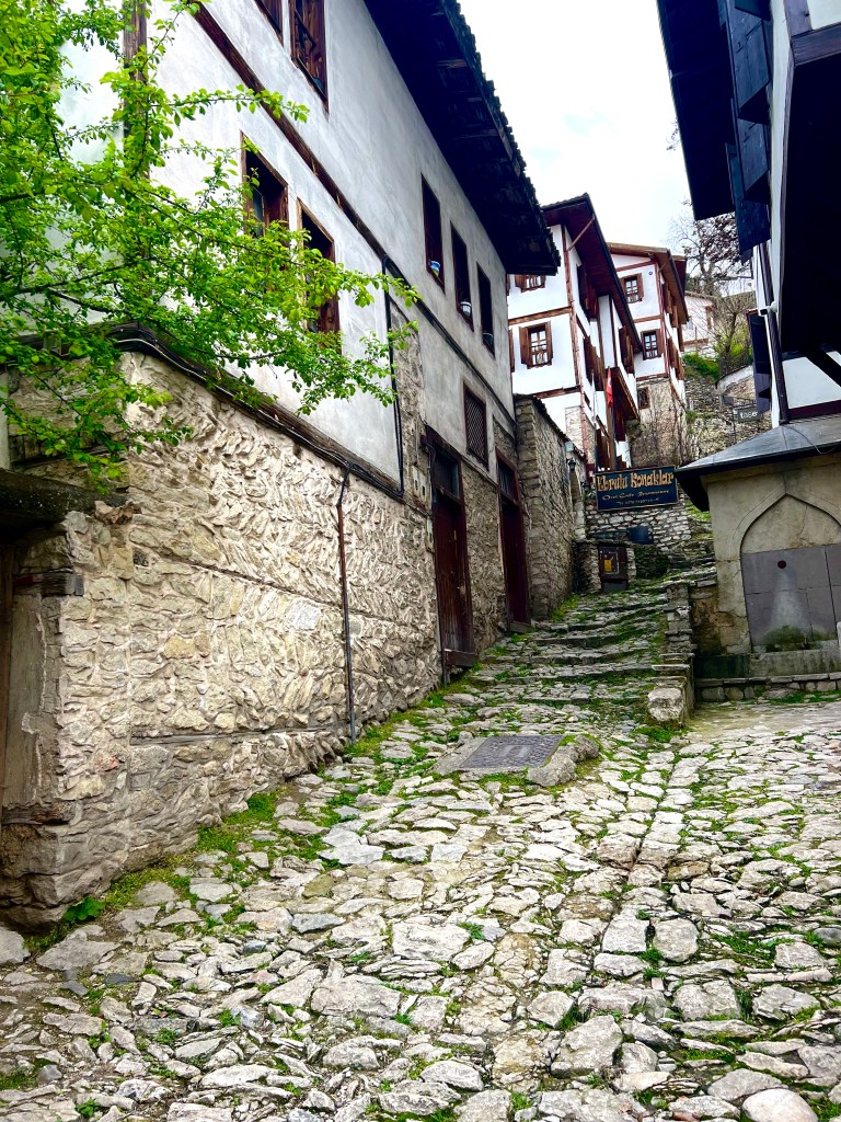 Walking in this town was a nightmare and of course, driving a bus was even worse. All the streets are rocks. I am not talking cobblestones but real rocks. The restaurant we went to was at least a 45 degree incline on rocks that were slippery. I was already thinking about coming down when I was going up. Thank God for the handsome Turkish waiters that helped us down. The restaurant was a magnificent inn on the Silk Road and dates back to the 17th century. The food was fabulous and included traditional Turkish salads and falafel. They even made special desserts for me and a fellow vegan.