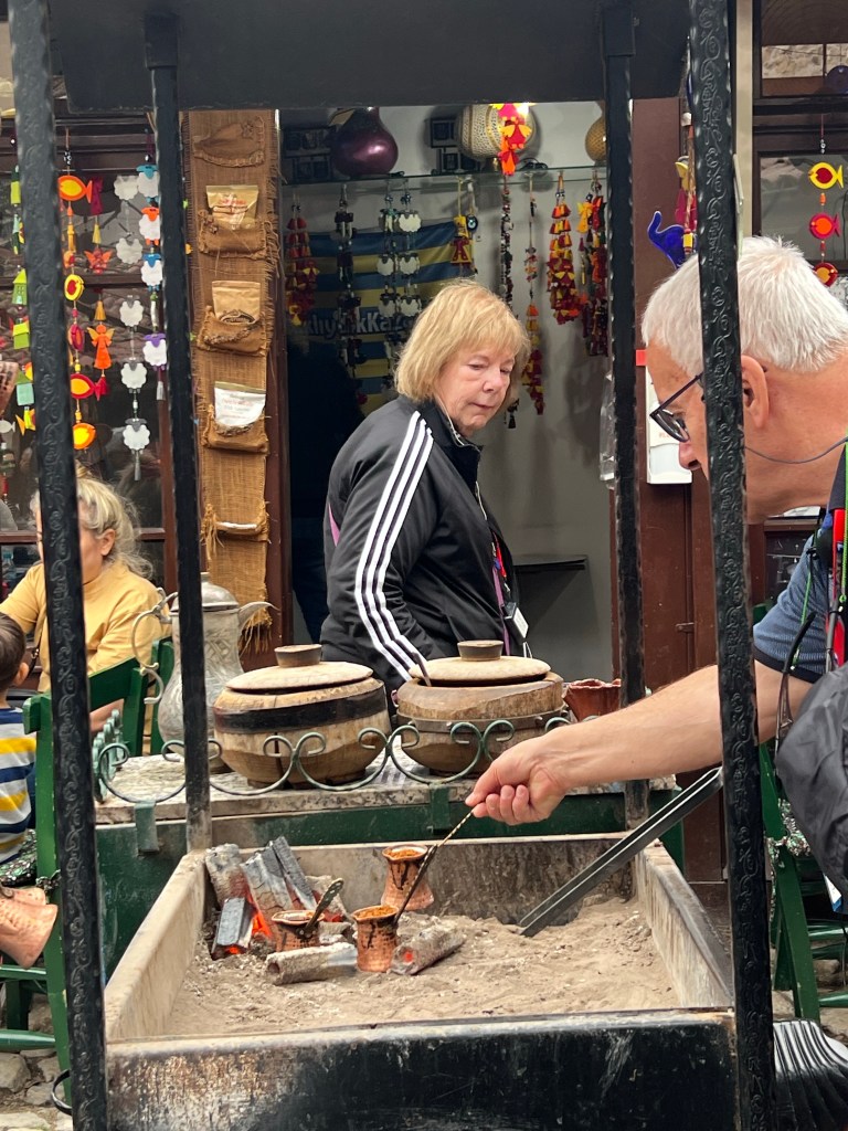 After leaving we walked around and then were given free time to walk through the bazaar. Below our guide, Mehmet, is helping to make traditional Turkish coffee over a wood fire.