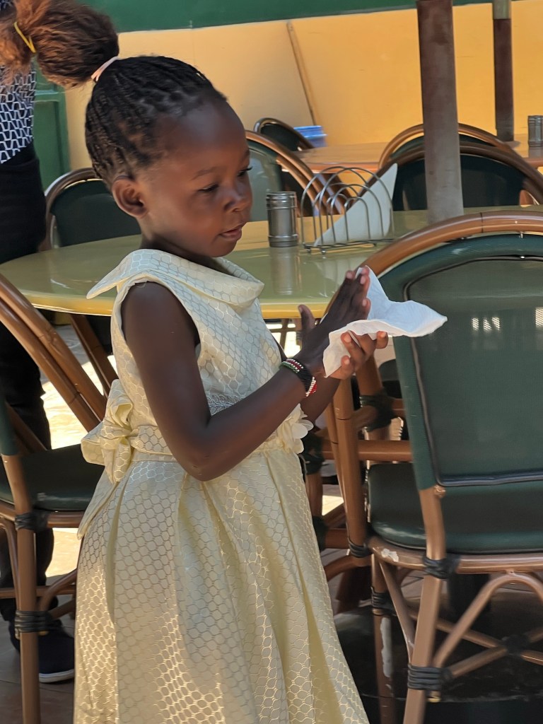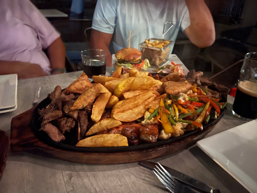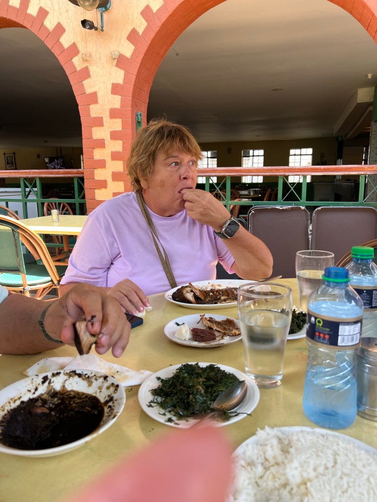 For dinner we decided to be more adventurous than eating at the hotel that really has exceptional food. We hooked up with the one member of our group who is not a Habitat member or a Boomer Babe. Her name is Laura and she was at a “mall” next to our hotel getting her hair braided for the entire afternoon. Wilburt recommended a restaurant in that mall for dinner so we met Laura there.
