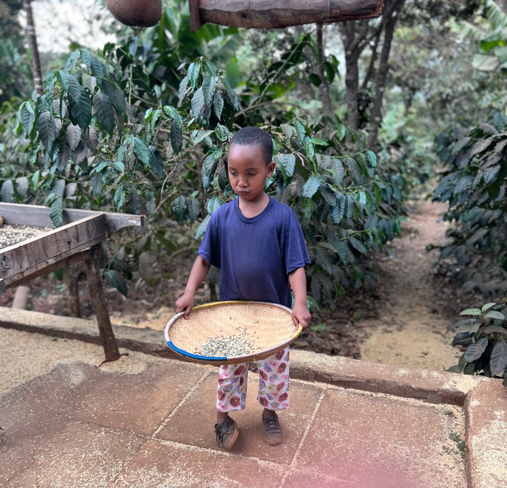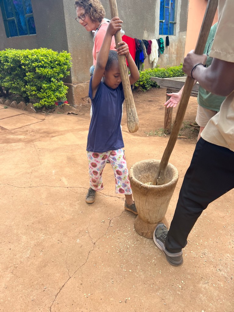 The beans are then put into a mortar and pestle and basically pulverized. They are then separated from the hull by shaking them in a basket. This is the owner’s six year old daughter, Elizabeth, who is shaking the basket.