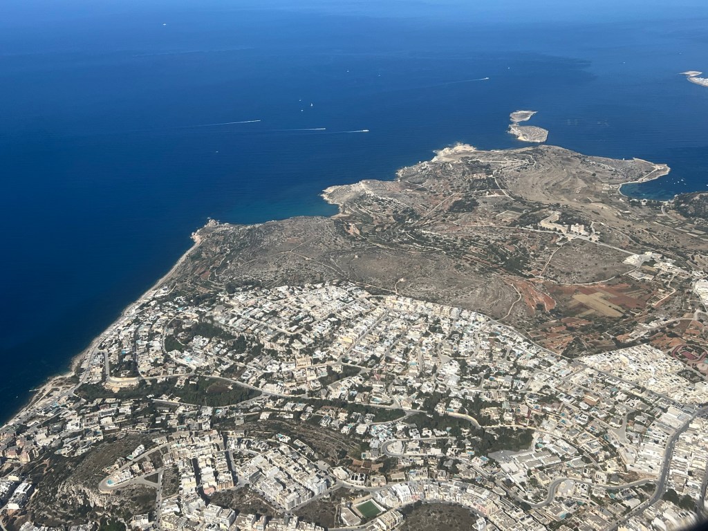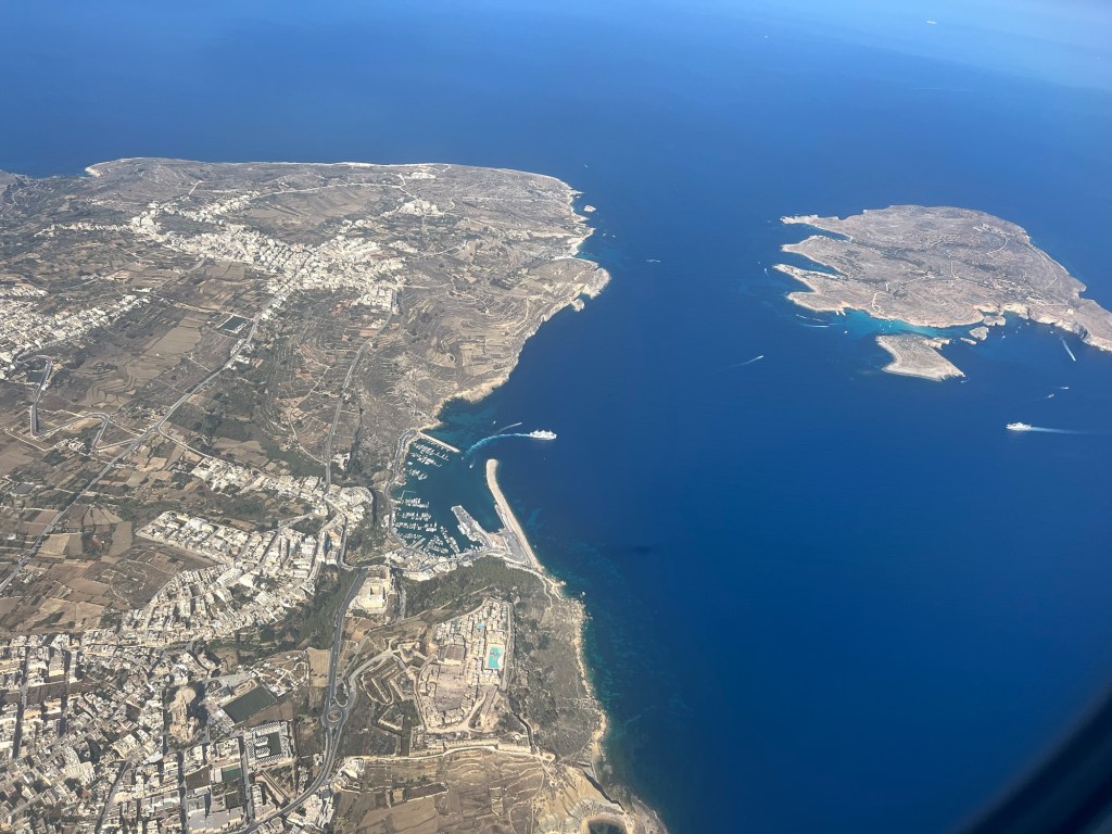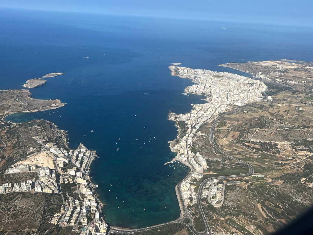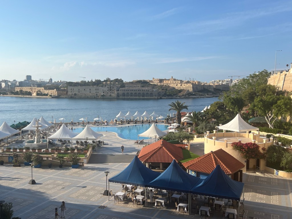 A long 24 hours but we are finally here in Malta. I never take pictures out of the window of an airplane but the descent into Malta and all the surrounding islands was worth it. Malta is south of Sicily so it is very close to the coast of Africa. It kind of reminds me of a cross between Morocco and Turkey. The hotel we are staying at is the Excelsior that they say is the best hotel in Malta. After what I saw today, I believe it. The rooms are elegantly furnished, I lucked out with room placement with a view of the Mediterranean Sea along with the pool.