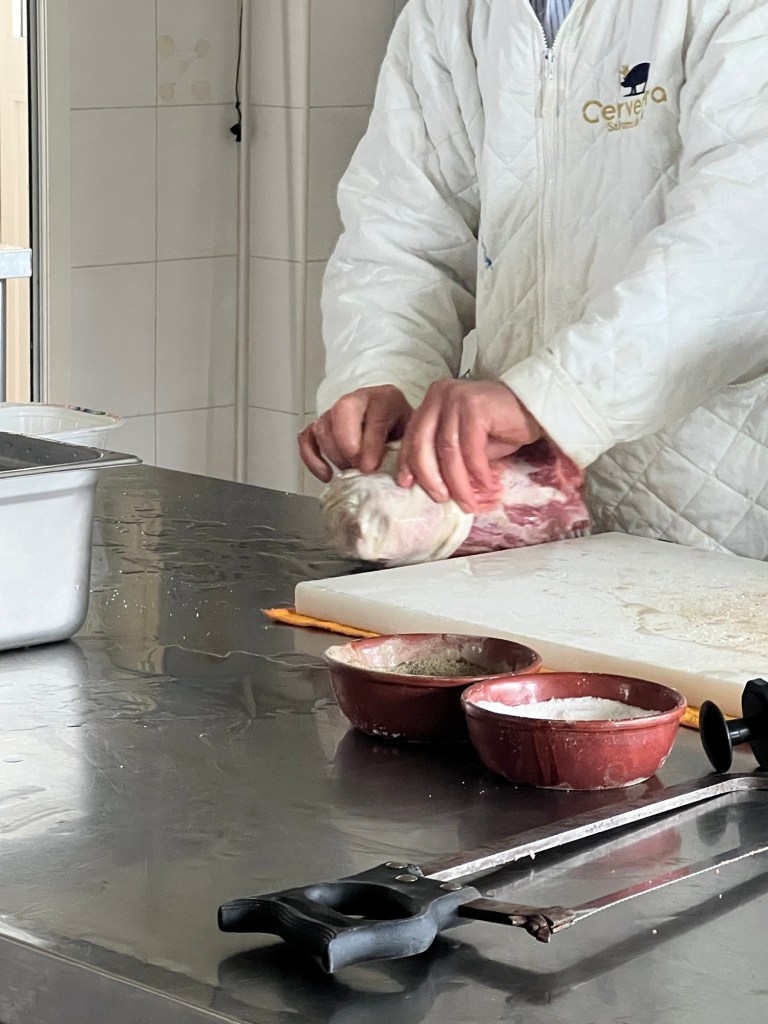 Today we went to a family run pig farm where the owner makes capicolli, pancetta and prosciutto. All of my favorite things. We started out having to put on haz-mat suits.
