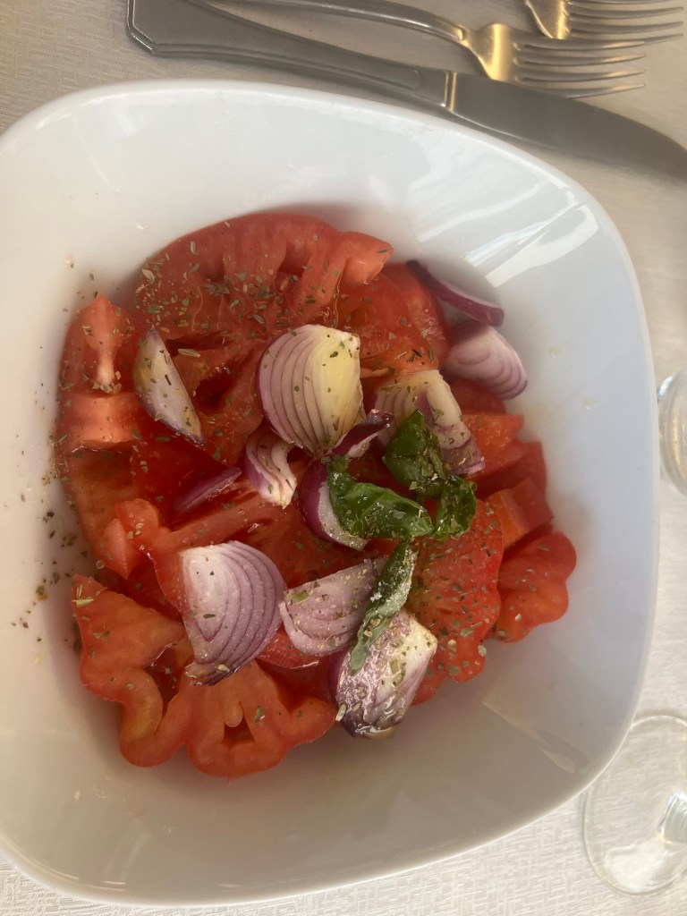 Because I don’t eat cheese the caprese salad was out. I got something better that everyone was jealous of. Tomato salad! The tomatoes here are wonderful and what a joy to eat a whole bowl of them.