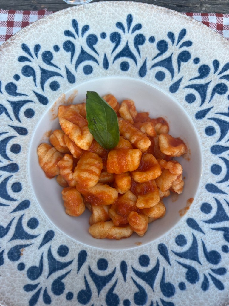 This is the finished product. Normally they add mozzarella to the sauce but they did not do that for mine. Interesting thing about making sauce in Italy. You either use onions or garlic in the sauce, not both. They do not use spices in their sauce like oregano like we do. Tomatoes, salt, olive oil and either onions or garlic. They clearly do not use garlic like we do.