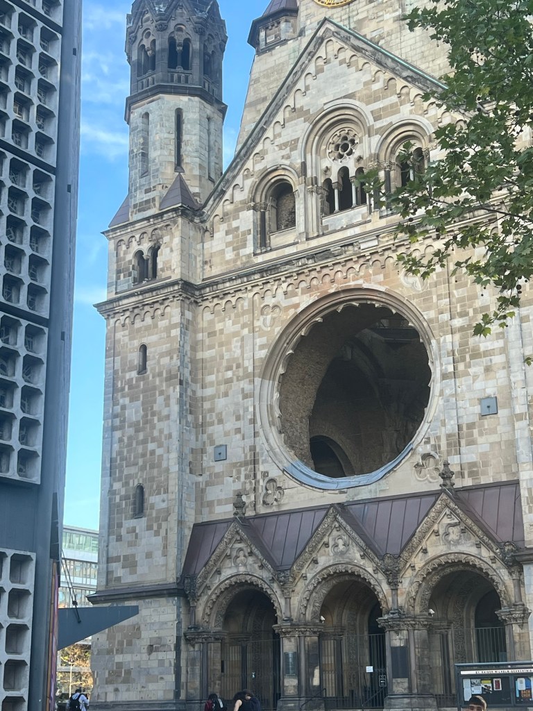 At 5:30 PM we meet up with our guide and the two new women who arrived today that will be part of the pre-tour. He took us on a brief walking tour of the area. Tommy commented that West Berlin was completely rebuilt after the war but East Berlin was not because it was a communist county. We stopped at a Protestant church called Kaiser Wilhelm church. They purposely did not rebuilt this church so people would not forget what happened during the war. They repaired the church to make it safe and opened it to the public and build a new ugly modern church next door for worshipping