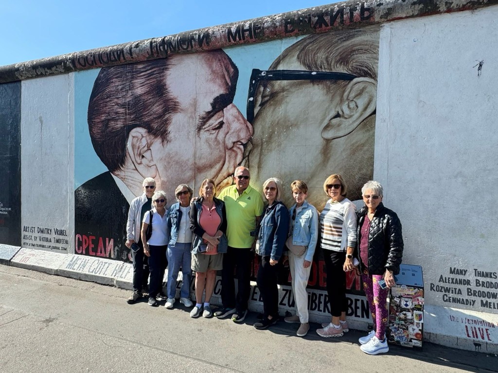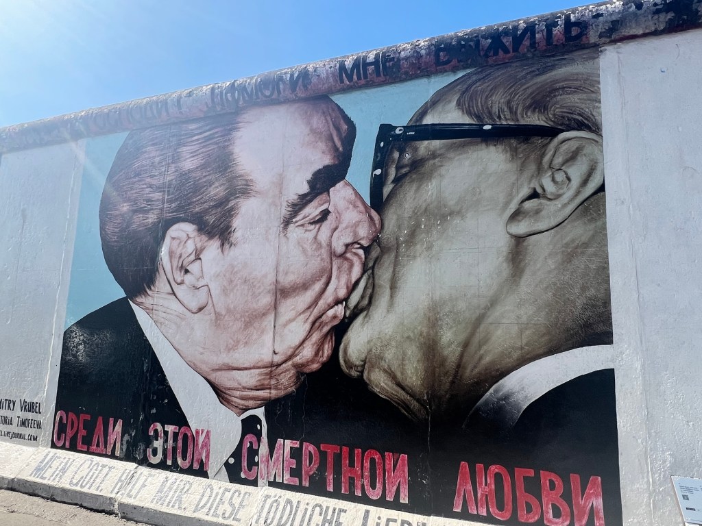 Our next stop was to the Eastside Gallery that is the longest section of the Berlin Wall that is now standing. It is an open air gallery on the banks of the Spree River. After the wall came down in November 1989 118 artists from 21 countries began painting on the wall. One of the most famous paintings is entitled “My God, Help Me To Survive This Deadly Love” and depicts Brezhnev kissing East German Statesman, Erich Honecker.