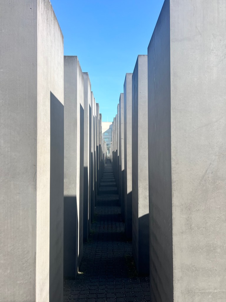 We began our morning on a city tour that was lead by a retired German military officer. Today was May 1 and in Germany it is a national holiday and considered to be like our Labor Day. Lots of police presence although they did not expect demonstrations until night time and certainly no where near our hotel. Our first stop was at the Memorial to Murdered Jews of Europe. It consisted of 2711 concrete slabs of various sizes and heights that resembled coffins. There was approximately 3 feet between them. It was a very somber and eerie experience to wander between them.
