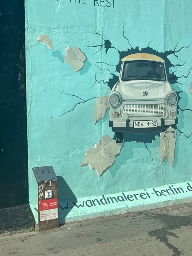 The second most famous painting is entitled “Trabant Breaking Thru the Wall”. A Trabant is a German car that appears to be the US answer to the Edsel. According to our guide it took 13 years to get a Trabant if you ordered one. We saw many tourists taking rides in them. They were produced in East Germany from 1957 to 1991.