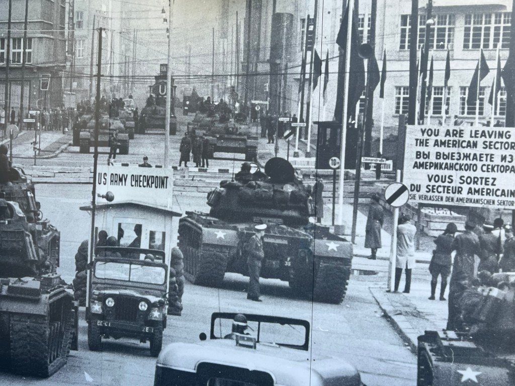 Next on to Checkpoint Charlie. This was used only for crossing of military personnel and diplomats. In 1961 an international incident between the Soviets and US occurred when the East German police demanded papers from a US diplomat going into East Germany to see an opera. Apparently it was not allowed to ask anyone for papers and there were tanks deployed by both the US and Soviets to Checkpoint Charlie.