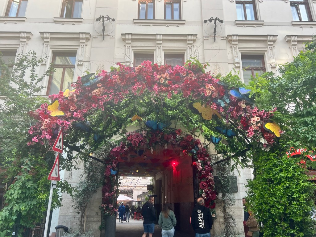 Our hotel was very centrally located near shopping, restaurants and the transit system. Free for anyone older than 65! Only Tommy had to buy a ticket. What was also neat about this neighborhood is they have what is called “ruin cafes.” These bars or cafes open in dilapidated buildings. Below is the entrance to one of these establishments near our hotel.