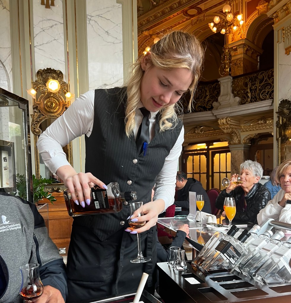So we order Bellinis and Bloody Mary’s before lunch. We have this darling waitress named Greta. She comes over to our table and asks us if we had breakfast. Kind of a strange question. Then she asks if we like sour cherry, apricot or plum. Therese and I are thinking dessert. Wrong! She is taking about 60% liquors on the house. So she hers me call Andy by his name. I have a strange way of saying it with the Rochester flat A’s. Doesn’t she mimic my accent to a tee! So Greta wheels in this big cart.